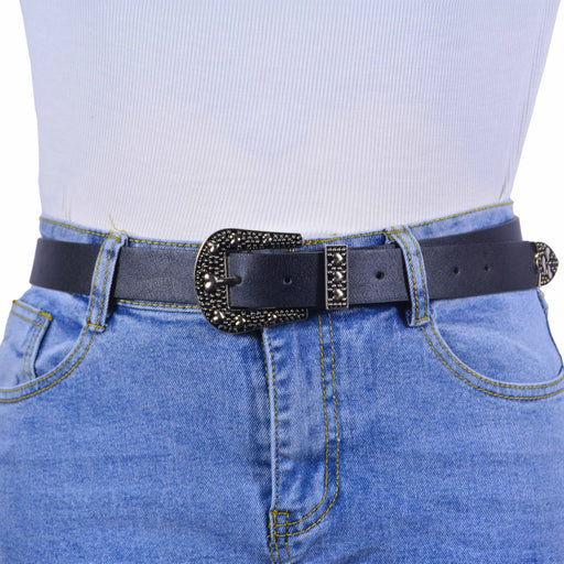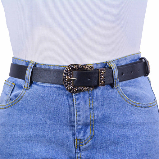 Cinturón Mujer Color Negro Hebilla Grande con Estrellas y Texturizada Con pasador Metálico Texturizado Medidas Ancho: 4cm aprox Largo: 110cm ap...