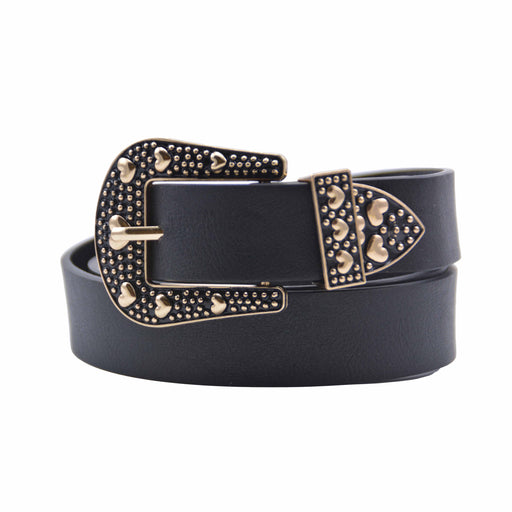 Ver todos los detallesCinturón Mujer Color Negro Hebilla Doble Corazón Dorada Con pasador sintético Medidas Ancho: 3cm aprox Largo: 110cm aprox (desde la hebilla)